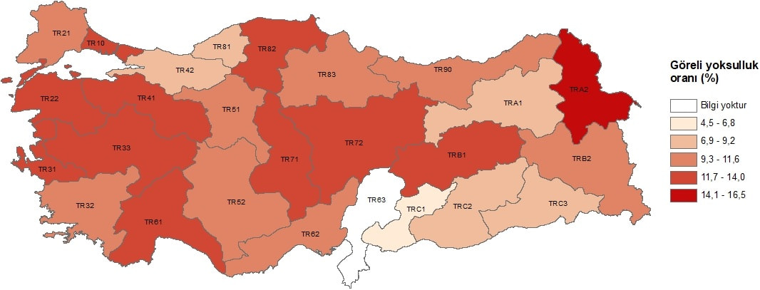 İBBS 2. Seviye bölgelerinin her biri için muadil hanehalkı kullanılabilir fert medyan gelirinin yüzde 50’sine nazaran hesaplanan yoksulluk hududuna nazaran, gelire dayalı nispî yoksulluk oranının en yüksek olduğu bölgeler; %16,1 ile TRA2 (Ağrı, Kars, Iğdır, Ardahan), %14,0 ile TR41 (Bursa, Eskişehir, Bilecik) ve %13,9 ile TR82 (Kastamonu, Çankırı, Sinop) oldu.